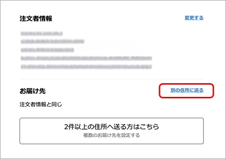 「別の住所に送る」のリンクから、お届け先情報を入力してください。【複数のお届け先を指定する場合】