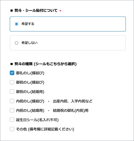 のしがけや小分け用の袋、手提げ用の袋などがご入用の場合は「注文備考」欄より必要な情報を入力してください。